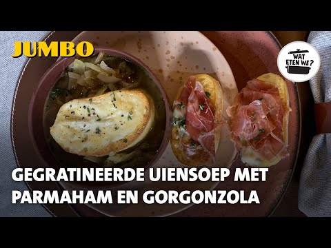 Wat eten we? Gegratineerde uiensoep met parmaham en gorgonzola - Courgettesoep Met Gorgonzola - Mmm... deze uiensoep is echt een traktatie! Lekker met een ciabatta erbij met gorgonzola en parmaham. Roberta gaat je laten zien hoe je dit recept maakt.